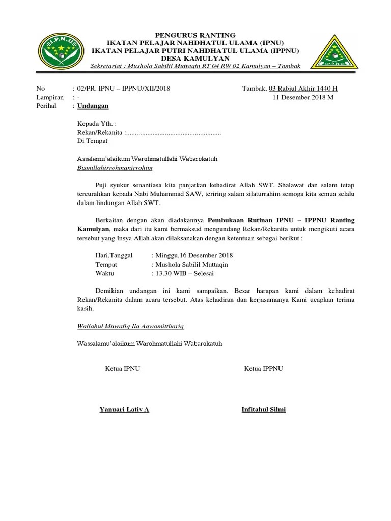 Ipnu desa babadan dengan nomor limpung untuk mendapatkan surat pengesahan pimpinan cabang atas kepengurusan pr. Surat tugas ipnu / contoh surat tugas ipnu ippnu contoh. 73 (1373 h) dan 54 (1954 . Jika anda sedang mencari informasi mengenai . Surat tugas ipnu / contoh surat undangan resmi ipnu ippnu.